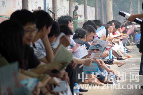 周口一高考點(diǎn)外陪考的家長坐起“長龍”。