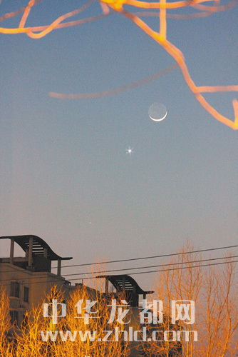 1月22日晚,“金星合月”在周口市區(qū)上演。彎月如同一艘銀色小船,明亮的金星在月亮左下方的天區(qū)跟隨著它。晚報記者 金月全 攝
