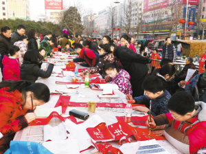 ????② 新春佳節(jié)即將來臨,三川大地處處洋溢著喜慶的氛圍。市區(qū)五一廣場,一群愛好書法的小朋友正在為市民義務寫春聯(lián)。(記者 侯俊豫 攝)