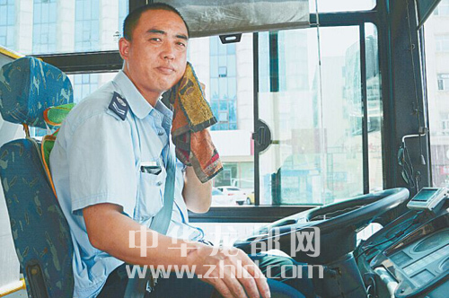 趁乘客上下車的間隙,3路公交車司機(jī)張師傅趕緊擦把汗。