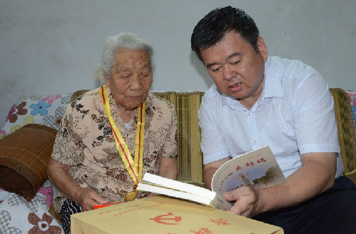 ????徐光一行先后來到抗戰(zhàn)老戰(zhàn)士老同志郭純義、張明鐸、王琪的家中,親切看望慰問他們,把黨和政府對抗戰(zhàn)老戰(zhàn)士老同志的關(guān)心傳遞到每個人心中。每到一處,徐光都與他們深入交談,了解他們的生活、起居、身體等情況,與老戰(zhàn)士、老同志一起回憶革命戰(zhàn)爭時期的崢嶸歲月,共話革命精神的傳承,祝愿他們健康長壽、生活幸福。慰問過程中,徐光滿懷崇敬之情,為抗戰(zhàn)老戰(zhàn)士老同志們佩戴由中共中央、國務(wù)院、中央軍委聯(lián)合頒發(fā)的“中國人民抗日戰(zhàn)爭勝利70周年”紀(jì)念章,送上慰問金和黨史書籍。徐光動情地說:“明天就是中國人民抗日戰(zhàn)爭和世界反法西斯戰(zhàn)爭勝利70周年紀(jì)念日,我代表市委、市政府來看望問候你們,并向你們致以崇高的敬意和良好的祝愿??箲?zhàn)年代,廣大老戰(zhàn)士、老同志出生入死、不怕犧牲、英勇奮斗,為奪取抗戰(zhàn)勝利立下了不朽的功勛,你們是人民的英雄、國家的功臣,沒有你們的犧牲奉獻(xiàn),就沒有我們今天的幸福生活,黨和人民永遠(yuǎn)不會忘記你們。紀(jì)念抗戰(zhàn)勝利,就是要弘揚偉大的抗戰(zhàn)精神,凝聚起實現(xiàn)周口崛起、富民強市、全面建成小康社會的強大力量,不斷把周口的各項事業(yè)推向前進(jìn)。”