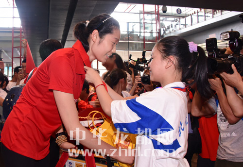 9月7日,一名學(xué)生在機(jī)場(chǎng)為載譽(yù)歸來的朱婷佩戴紅領(lǐng)巾。