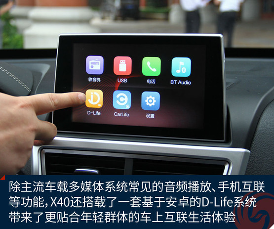 不過(guò)跟奔騰X40接觸兩天之后,會(huì)發(fā)現(xiàn)它大可不必在對(duì)手林立的市場(chǎng)中血拼顏值,靠實(shí)力不俗的獨(dú)門絕技一樣能夠輕松獲得一席之地。既然面向年輕用戶,豐富的車載娛樂(lè)系統(tǒng)很關(guān)鍵。大屏幕、手機(jī)互聯(lián)等等似乎已經(jīng)是這類車的標(biāo)配。奔騰X40更進(jìn)一步,所搭載的D-Life系統(tǒng)讓我們看到了它引領(lǐng)潮流的勁頭。