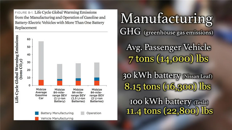 ????????無疑,電池比起傳統(tǒng)內(nèi)燃機排放的溫室氣體要多的多。普通的內(nèi)燃機乘用車在生產(chǎn)過程中會產(chǎn)生7噸的溫室氣體排放,而使用30千瓦時電池的日產(chǎn)聆風(fēng)會排放8.15噸溫室氣體。至于100千瓦時電池的特斯拉Model S P100D更是會產(chǎn)生11.4噸的溫室氣體。
