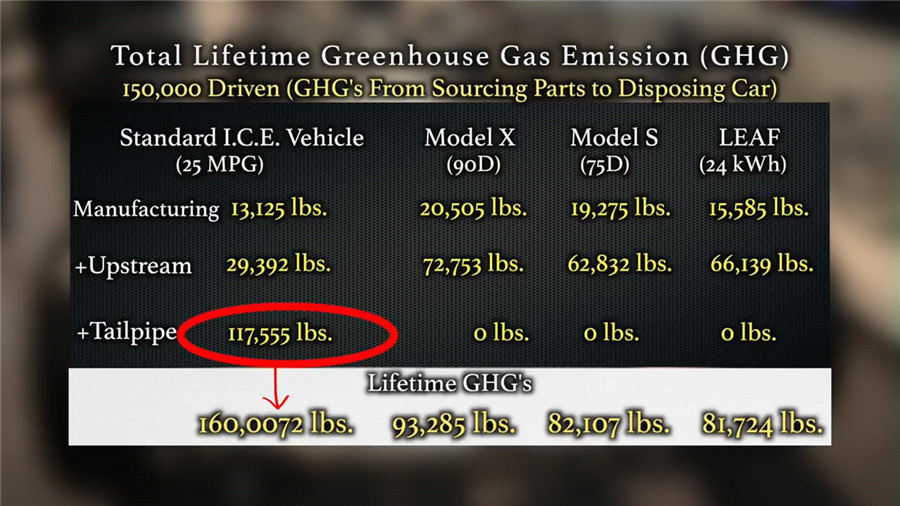 ????????這張表更加清晰,分別統(tǒng)計了普通內(nèi)燃機汽車(25MPG=百公里油耗9.4升)、特斯拉Model X 90D、Model S 75D和聆風(fēng)(電池容量24kWh)在車輛生產(chǎn),燃油/電能生產(chǎn)過程以及駕駛使用過程中的排放,可以看到,盡管電動車在車輛生產(chǎn)、電能生產(chǎn)過程中產(chǎn)生的排放更高,但行駛工程中的零排放仍然使其在整個生命周期中的排放更低。