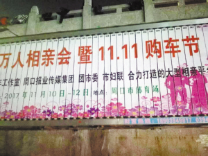 ????據(jù)了解,周口萬人相親會(huì)是由市委組織部青年工作辦公室、共青團(tuán)周口市委、市婦聯(lián)、周口報(bào)業(yè)傳媒集團(tuán)聯(lián)合主辦的大型相親平臺(tái)。為再一次給廣大消費(fèi)者搭建更好的選車、購車平臺(tái),周口報(bào)業(yè)傳媒集團(tuán)決定于11月10日至12日在市體育場(chǎng)隆重舉辦2017周口萬人相親會(huì)暨“雙十一”購車節(jié)。