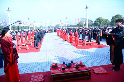 記者在現(xiàn)場(chǎng)看到,16對(duì)新人在司儀的引導(dǎo)下,采用中國古典婚禮儀式,有牽紅線、結(jié)發(fā)、拜天地等程序,儀式簡(jiǎn)單而隆重,新人家屬、1000多名市民圍觀見證了新人喜結(jié)連理。