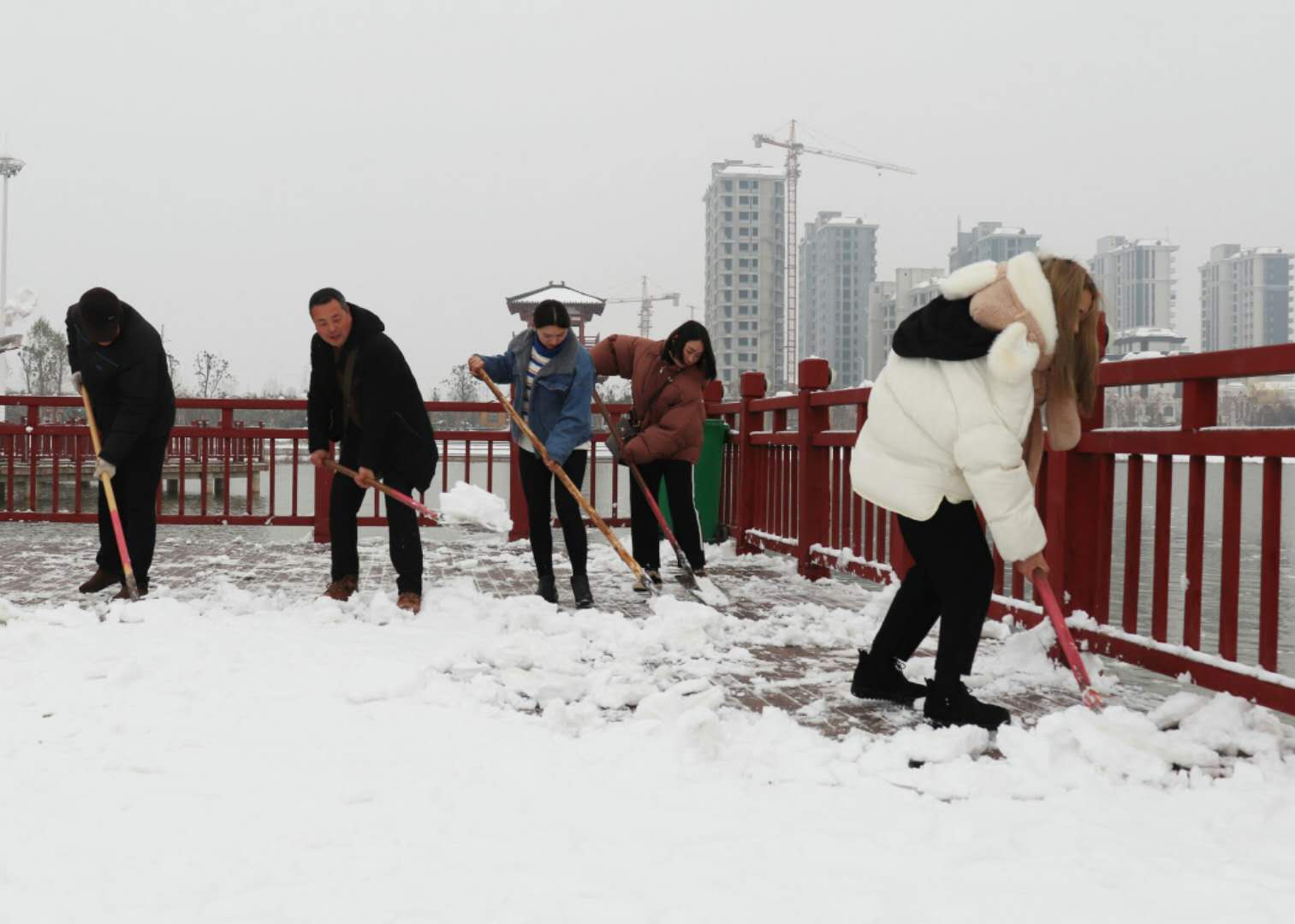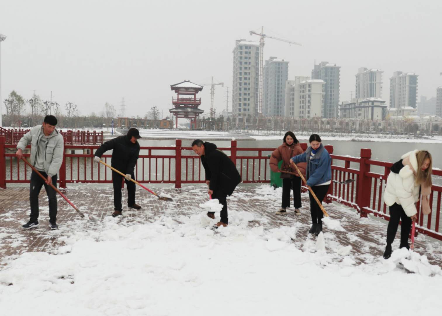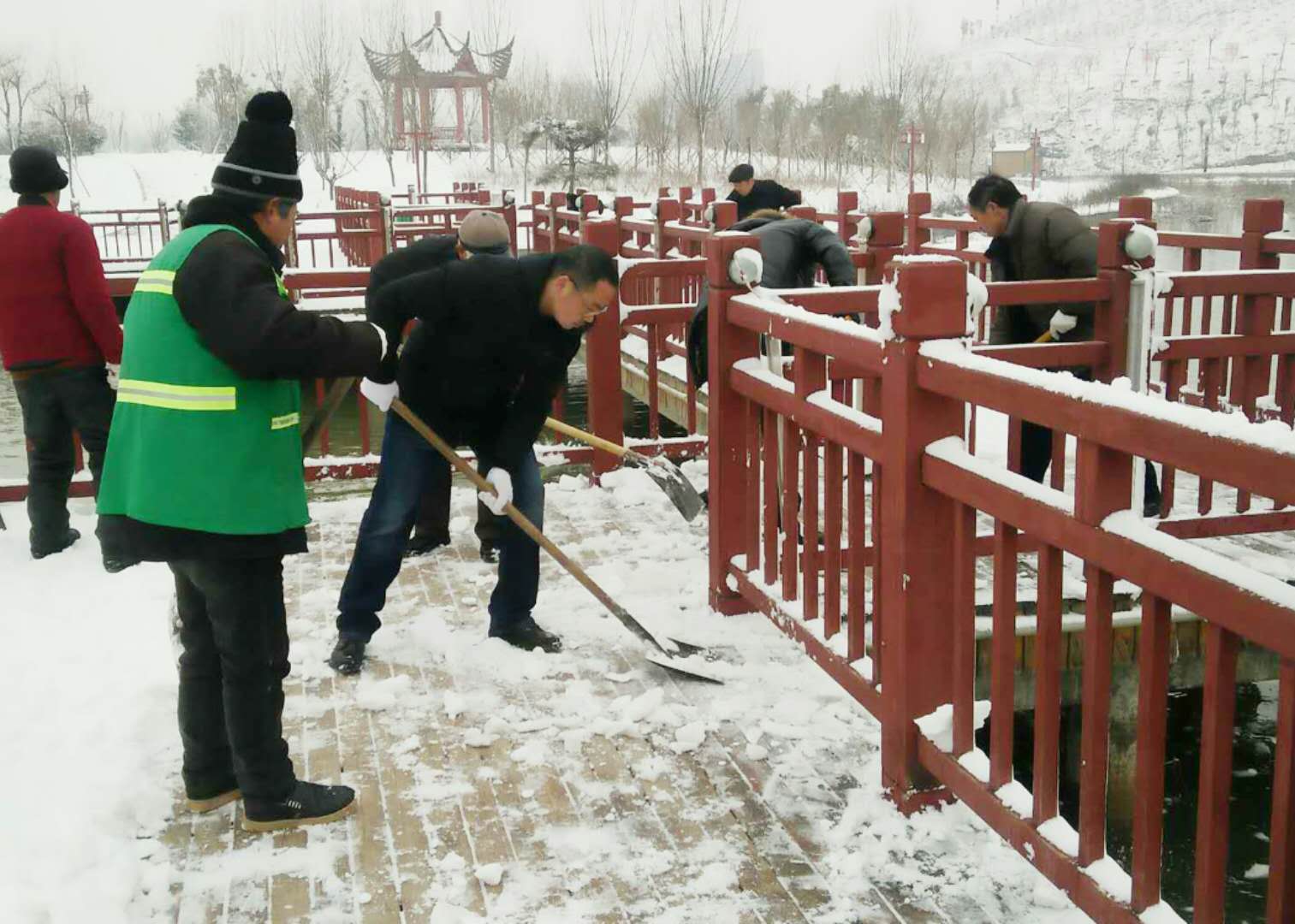 經(jīng)過(guò)兩場(chǎng)大雪的洗禮,空氣格外清新,但鹿邑上清湖公園內(nèi)積雪嚴(yán)重,且已結(jié)冰,給市民游園帶來(lái)了諸多不便和隱患。從早晨到下午4點(diǎn)半,鹿邑市政園林中心的干部職工和道德公益志愿者在上清湖集合后,投入鏟雪掃雪行動(dòng),經(jīng)過(guò)一天的緊張清掃,上清湖湖面棧道和園內(nèi)公路上的積雪清掃一遍。道德公益志愿者鐘華在微信群里提出建議后,有十幾位志愿者報(bào)名參加上清湖義務(wù)掃雪活動(dòng)。