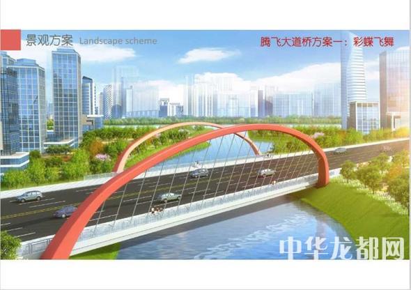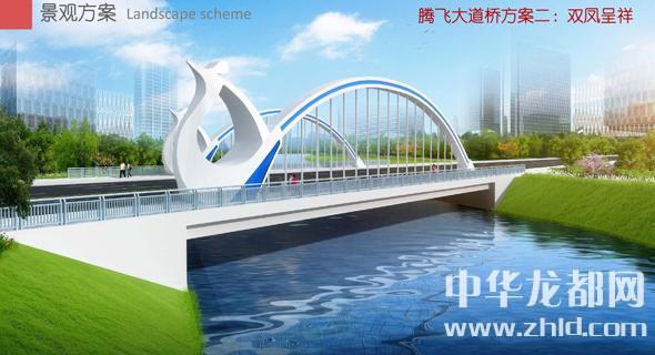 騰飛大道橋的設(shè)計方案有兩套,分別為“彩蝶飛舞”和“雙鳳呈祥”。“彩蝶飛舞”為下承式鋼管拱橋,寬36米。記者從效果圖中看到,橋兩側(cè)的拱圈,極具色彩感,給人一種賞心悅目的感覺。“雙鳳呈祥”為裝飾鋼管拱橋,寬36米。該橋采用“雙鳳”造型,象征天下太平,富含吉祥之意。