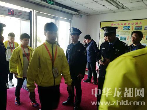 在市體育館的入口處設(shè)有安檢門,門口兩側(cè)各有4名民警檢查進入場館的人員證件,無論是工作人員還是運動員、裁判員都必須憑組委會發(fā)放的證件方能進入。另有2名民警手持金屬探測儀,在進入的人員身上探測可疑金屬,以防止有人誤帶管制刀具等違禁品進入場館內(nèi)。進入當日舉行舉重比賽的場館后,記者看到有身穿警服的民警在現(xiàn)場不時走動,維持賽場秩序。