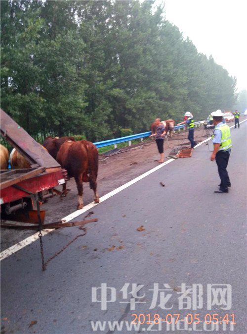 中華龍都網(wǎng)訊(周口報業(yè)全媒體記者 姬慧洋 通訊員 劉杰 文/圖)“在大廣高速2025公里西半幅附近發(fā)生一起單方事故,幾十頭牛散落在路面,請求處警?!?月5日5時許,周口市公安局交通管理支隊高速二大隊扶溝中隊接到110指令稱。