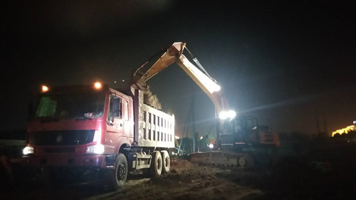 在德和家園施工現(xiàn)場,雖近22時(shí),挖掘機(jī)依然揮舞著鐵臂在不停地挖土,渣土車來來往往地運(yùn)送著土方,靜謐的夜空在德和家園的施工現(xiàn)場也躁動(dòng)起來。