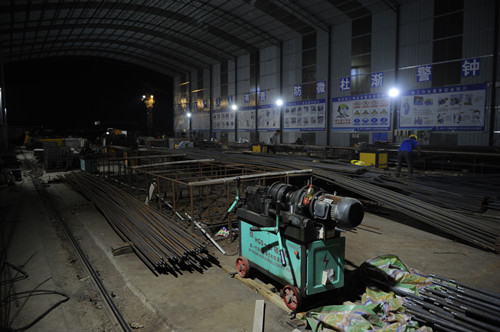當(dāng)晚21時(shí)許,記者在泰和家園施工現(xiàn)場看到,鋼筋加工棚的工人們正在進(jìn)行鋼筋的切割,他們在為明天施工準(zhǔn)備鋼筋材料。A1#樓正在進(jìn)行墊層的澆筑工作,A8#樓正在進(jìn)行負(fù)一層及周邊地庫的鋼筋綁扎及模板加固工作,A9#樓正在進(jìn)行負(fù)一層墻柱鋼筋及模板內(nèi)架搭設(shè)工作。現(xiàn)場2臺(tái)鋼筋切割機(jī)在不停地運(yùn)轉(zhuǎn),9臺(tái)塔吊在持續(xù)工作,40余名施工人員在場地內(nèi)各司其職,緊張而有序地趕進(jìn)度,整個(gè)施工現(xiàn)場如火如荼。