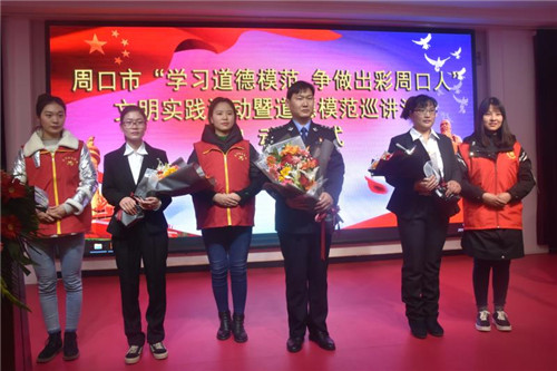 市公安局交警王凱偉是2018年敬業(yè)奉獻類中國好人,省五四獎?wù)芦@得者,經(jīng)常參加公益活動,持續(xù)幫助貧困女孩小夢麗和她家人,用善舉挽救了這個貧困家庭。扶溝縣曹里鄉(xiāng)刁灣小學(xué)教師李艷琴扎根鄉(xiāng)村教育一線無怨無悔,數(shù)年如一日照顧癱瘓在床的婆婆任勞任怨,曾獲縣最美鄉(xiāng)村老師稱號。鹿邑伯陽中學(xué)“90后”女教師劉交交剛參加完高考后父親因病去世,母親身患殘疾。她不向命運低頭,靠打工收入和微薄的助學(xué)金維持生活和學(xué)業(yè),為照顧母親,她攜母上大學(xué),曾獲中國大學(xué)生自強之星等稱號,被授予省五四獎?wù)隆H坏赖履7峨m然都是最平凡的人,但都有一顆不平凡的心,他們的感人事跡散發(fā)著奪目的光芒,深深感染了現(xiàn)場的每一位聽眾,不少人流下了感動的淚水。
