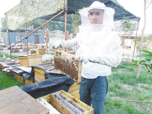 6月24日,沈丘縣付井鎮(zhèn)九里村的退伍軍人蘇尚方,正小心翼翼地從蜂箱里取出蜂蜜板,準(zhǔn)備采收蜂蜜?!拔茵B(yǎng)了120多箱蜜蜂,年產(chǎn)蜂蜜3000多公斤,經(jīng)濟(jì)收入十分可觀?!碧K尚方說(shuō),他專門成立了蘇家養(yǎng)蜂專業(yè)合作社,帶領(lǐng)當(dāng)?shù)刎毨粢黄鹈撠氈赂?。謝辛凌 攝