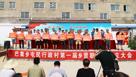 “段志軍每年都捐資捐物回報家鄉(xiāng),他去年捐30萬為巴集大街和屯民村安裝的200多盞路燈已經(jīng)亮了,捐85萬元新建的村室馬上竣工,將是全縣標準最高的,現(xiàn)在又捐60萬元;劉振發(fā)這幾年捐了40萬多,給村里修路、栽樹、幫扶貧困戶,今天又捐26萬;鄉(xiāng)賢會成立之前,大家已累計捐款240多萬元……”在今年8月6日屯民行政村鄉(xiāng)賢會成立儀式上,朱明理宣布捐款名單時多次被雷鳴般的掌聲打斷;“最難忘的就是村口的那棵大楊樹,最好吃的就是中午剩的涼面條、晚上嗑著大蒜吃?!痹谌T峽創(chuàng)業(yè)的劉振發(fā)的發(fā)言勾起了眾多游子的親情回憶;“啃個干饃,灶火里燒個辣椒一砸,撒點兒鹽就是最好吃的。”在商丘任職的徐其山接過話茬說;“事業(yè)越大,工作越忙。但是,他們從四面八方歸來,這就是對家鄉(xiāng)的情誼,我們村肯定會越來越好?!编l(xiāng)賢徐其民感慨地說;“從屯民走出的大學生不少,如今長成了企業(yè)家、行政干部等等,如參天大樹,卻不忘根、不忘本,這就是屯民的驕傲。”從事教育行業(yè)35年的鄲城二高校長趙耀身為屯村一員感觸良多……