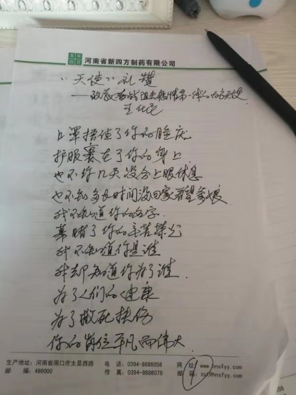 “阻擊疫情的陣容里你默默奉獻(xiàn)著熱和光你舍棄小家 顧著大家 心似蓮花 情滿海洋”1月30日,50多歲愛好寫詩的周口市民王化民致電記者,為了表達(dá)對(duì)奮戰(zhàn)在疫情一線白衣天使的崇敬,他特意寫了一首詩歌來禮贊。