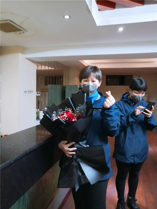 隊伍集合完畢,接下來的一幕令許聽聽始料未及。來自當(dāng)?shù)厣鐓^(qū)的工作人員,手捧蛋糕、鮮花,唱著生日歌,來到許聽聽面前,向她致以生日祝福。特殊時期,身處抗疫一線,忙于照顧病人,許聽聽此前對自己的23歲生日沒有任何憧憬,她告訴記者,其實(shí)她當(dāng)天沒想起來是她的生日,面對突如其來的生日祝福,許聽聽說:“當(dāng)時的心情既激動又感動。”。