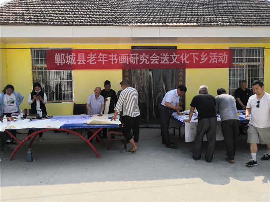 曾慶祥、李宏亮、閆子明、朱好明、單建勛、劉祖祥等9名老年書畫名家一下車,顧不上休息,就紛紛潑墨揮毫,現(xiàn)場為群眾義寫義畫486幅,為村民們獻(xiàn)上一場難得一遇的文化盛宴。雖然天氣炎熱,但是書畫家不辭辛苦,就連已經(jīng)89歲的李宏亮老師中間也不曾休息片刻,直到中午12:30才收筆,熱火朝天的工作激情贏得了干部群眾的一致好評,也都豎起大拇指為他們點贊!