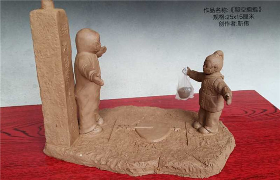 所捐《逆行之守護者》泥塑作品,高50厘米,寬26厘米,描述全副武裝的醫(yī)護工作者一手握針管殺死病毒,一手提藥箱救人,謳歌了疫情中逆行的醫(yī)護工作者不畏犧牲、與新冠病毒搏斗,冒死救治病毒感染者的偉大精神?!陡艨論肀А肥侵v述我市扶溝縣人民醫(yī)院抗疫故事,疫情期間奮戰(zhàn)在抗疫一線的劉海燕醫(yī)生和為自己送年夜飯的女孩隔空擁抱的感人場景,讓無數(shù)人熱淚盈眶。