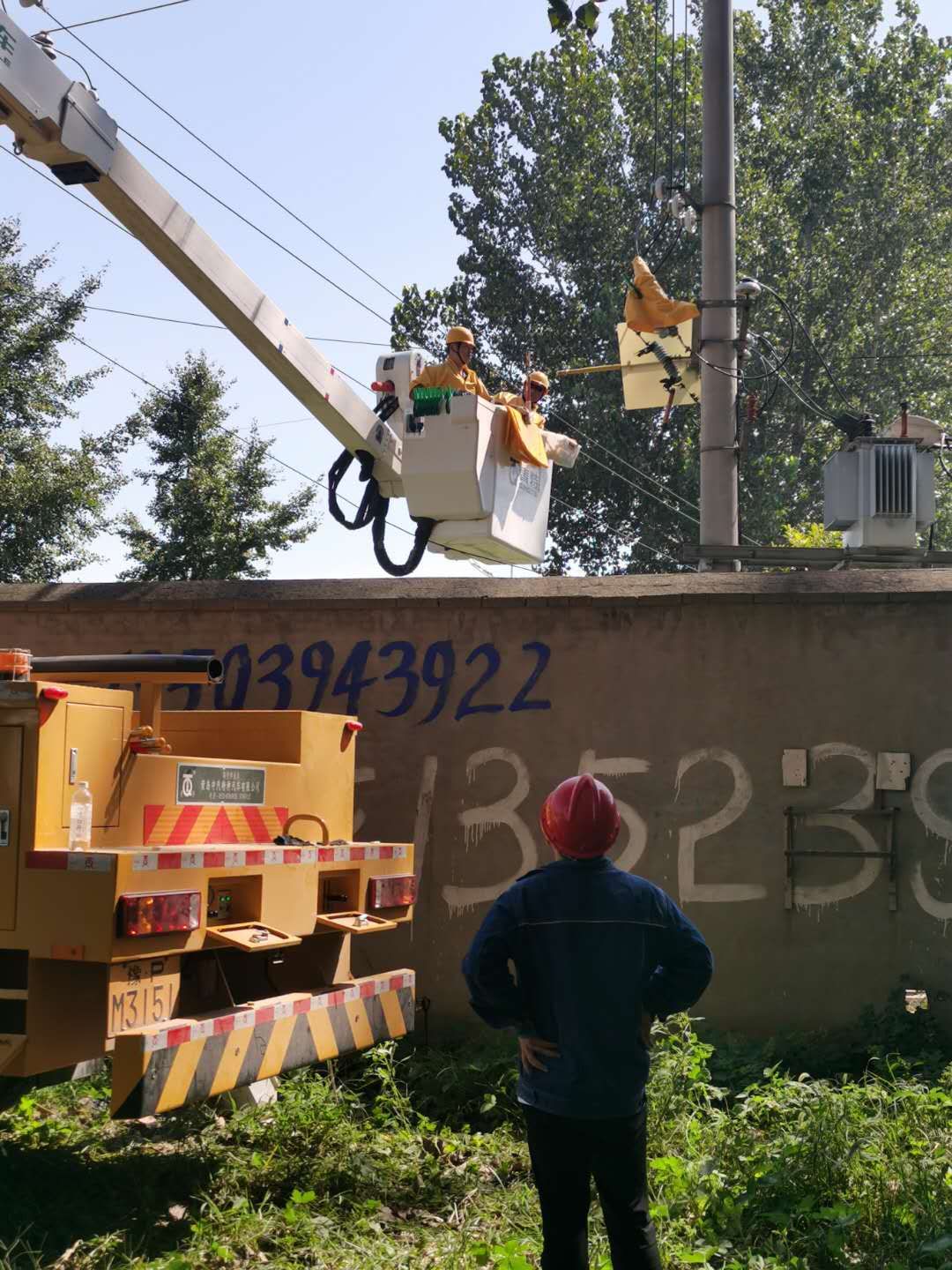 9月5日中午,“秋老虎”發(fā)威,燠熱難耐。國網(wǎng)西華縣供電公司城關(guān)供電所工作人員穿著長袖工作服,頭戴安全帽,冒酷暑進行高空搶修作業(yè)。