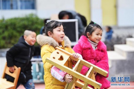 重慶市石柱土家族自治縣中益鄉(xiāng)小學(xué)的同學(xué)們搬著小椅子前往操場觀看文藝表演。當(dāng)日,“我的中國夢——文化進萬家”中國視協(xié)文藝志愿服務(wù)小分隊走進中益鄉(xiāng)小學(xué),為師生們帶來精彩的文藝表演(2019年12月12日攝)。新華社記者王全超 攝