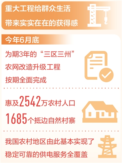 從“用上電”到“用好電”,今年6月底,為期3年的“三區(qū)三州”農(nóng)網(wǎng)改造升級(jí)工程按期全面完成,惠及2542萬(wàn)農(nóng)村人口、1685個(gè)抵邊自然村寨,我國(guó)農(nóng)村地區(qū)由此基本實(shí)現(xiàn)了穩(wěn)定可靠的供電服務(wù)全覆蓋。