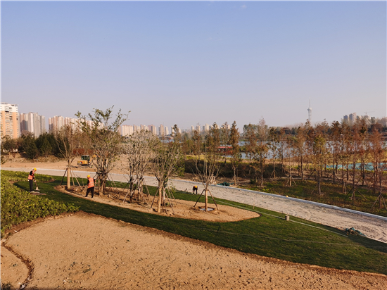 11月11日,在中心城區(qū)沙潁河北岸周口大道至八一大道段生態(tài)改造工程EPC項目施工現(xiàn)場,施工人員正在進行地被植物的種植、綠化樹木的養(yǎng)護。