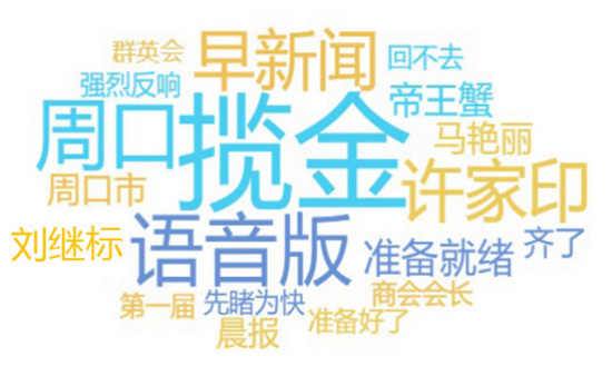 網(wǎng)絡(luò)熱詞反映了網(wǎng)民關(guān)注的重點,詞云圖中大大的“攬金”二字占據(jù)詞云圖中央,可見攬金是真的攬金,據(jù)悉,首屆周商大會簽約項目31個,總投資達429.7億元人民幣?!霸S家印”“馬艷麗”在整個圖中也是光彩奪目,作為周口人,走上北上廣深的成功人士還心心念念家鄉(xiāng)的發(fā)展,讓老鄉(xiāng)們倍感溫暖,家鄉(xiāng)人關(guān)注他們?yōu)榧亦l(xiāng)發(fā)展做出的努力和他們的動態(tài)也是再正常不過了。