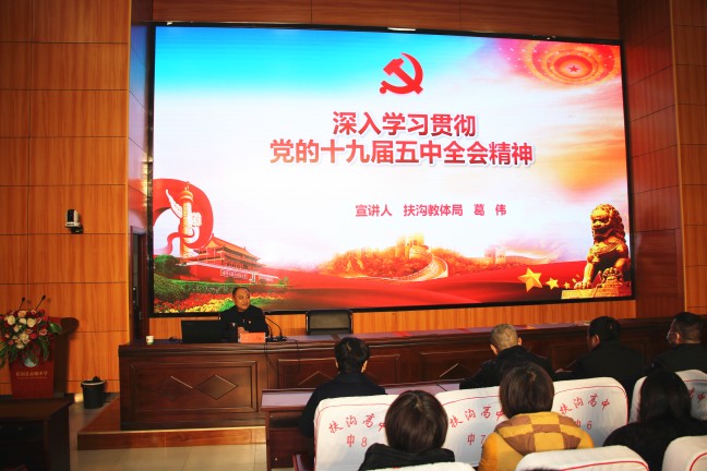 12月12日下午,扶溝縣高中德馨樓七樓會議室掌聲陣陣、座無虛席,扶溝縣學習貫徹黨的十九屆五中全會精神縣委宣講團縣高中報告會正在這里舉行,宣講會特邀縣教體局黨組書記葛偉進行宣講,局機關(guān)班子成員,縣高中班子成員和400余名教師參加了宣講會。
