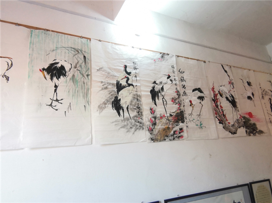 在建豪工作室的斜對(duì)面,是50歲村黨支部書(shū)記、村文聯(lián)主席盧全禮的書(shū)畫(huà)工作室。盧全禮書(shū)畫(huà)兼擅,還會(huì)武術(shù)、木刻、舞獅子,是附近有名的才子。記者看到,他為太康縣第二屆農(nóng)民豐收節(jié)創(chuàng)作的中國(guó)畫(huà)《黃土地的心聲》,以該村嗩吶吹奏藝人幸福而夸張的演出情景,歌頌農(nóng)村脫貧攻堅(jiān)取得的巨大成果,極具鄉(xiāng)土氣息。在他的畫(huà)室,滿身文藝范兒的五西村民,正以新時(shí)代松鶴延年吉祥農(nóng)民畫(huà),齊心打造中原畫(huà)鶴第一村。經(jīng)過(guò)培訓(xùn)的農(nóng)村大嫂大媽執(zhí)筆齊描畫(huà),一時(shí)鶴鳴九皋,翩翩欲飛。