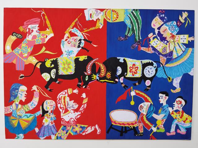 2020年4月,錢(qián)玉燕無(wú)意中看到“決勝全面小康”第二屆全國(guó)農(nóng)民畫(huà)展覽征稿啟事,對(duì)農(nóng)村生活非常熟悉的她決定一試。她立足于周口平原農(nóng)區(qū)的特色,深深領(lǐng)悟周口幾千年來(lái)的農(nóng)耕文化,對(duì)參賽作品進(jìn)行了認(rèn)真、系統(tǒng)地構(gòu)思,最終決定以歡慶豐收的斗?;顒?dòng)為題材,把農(nóng)耕文化的深遠(yuǎn)、厚重與豐富的藝術(shù)表現(xiàn)手法相融合。她采用普通的繪畫(huà)卡紙,運(yùn)用多種繪畫(huà)顏料,充分借鑒漢畫(huà)藝術(shù),吸收中原地區(qū)的剪紙文化、西方藝術(shù)大師畢加索立體畫(huà)派的藝術(shù)風(fēng)格和古埃及畫(huà)的靈感,以艷麗的紅、藍(lán)為主背景,采取夸張的表現(xiàn)手法,把斗牛的場(chǎng)景表現(xiàn)得淋漓盡致。作品創(chuàng)作發(fā)揮了豐富的想象力,人物動(dòng)物造型借鑒中國(guó)民間藝術(shù)剪紙的方式表現(xiàn),以大膽、夸張、強(qiáng)烈的色彩搭配,把無(wú)限深廣的空間“壓扁”到一個(gè)平面上。