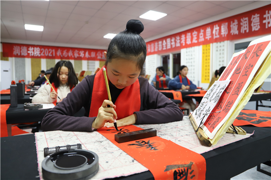 2月3日,記者在鄲城縣潤德書院看到,“我為我家寫春聯(lián)”活動正緊張地進行著,數(shù)十名書法小學(xué)員端坐案前、從容執(zhí)筆、揮毫作書,一個個福字工整又靈活,一副副對聯(lián)娟秀又詩意。孩子們在屋內(nèi)全神貫注地寫字,把最美好的祝福用自己的所學(xué)展示給家庭;家長們在窗外掂腳張望,望子成龍、望女成鳳的心態(tài)表露無遺。