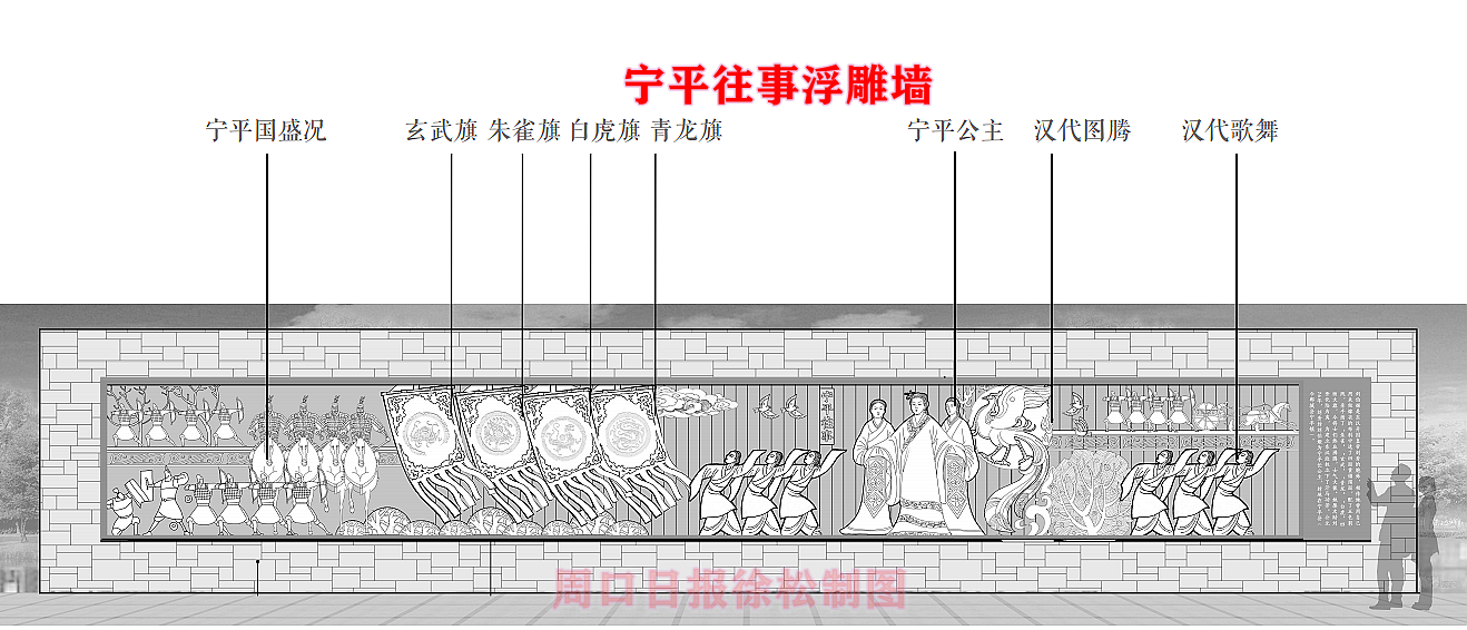 在縣委、縣政府綜合大樓東側(cè)的核心形象段,配合鄲城行政中心打造莊嚴(yán)、大氣氛圍的同時,對鄲城歷史文化進(jìn)行了集中展示,包括鄲城的歷史沿革,鄲城的發(fā)展理念,歷史故事等。其中調(diào)水渠西側(cè)以現(xiàn)有人民廣場對應(yīng)的綠地為基礎(chǔ),設(shè)置了較多的歷史文化節(jié)點(diǎn)。如調(diào)水渠新華路橋頭北側(cè)的廉政文化廣場,講述了漢朝名臣汲黯的故事。汲黯為人耿直,直諫廷諍,親政愛民,敢于承擔(dān)責(zé)任,漢武帝劉徹稱其為“社稷之臣”。汲黯廉政廣場建設(shè)在此處更有著深遠(yuǎn)的意義,它一方面提醒老百姓要了解歷史、敬畏先賢,同時也激勵著鄲城縣的各級黨員干部要在習(xí)近平新時代中國特色社會主義思想引領(lǐng)下,“不忘初心、牢記使命、廉潔奉公、一心為民”。