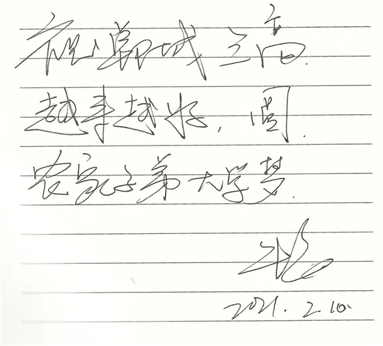 朱婷雖然很少回家,但是一直關(guān)注老家鄲城的發(fā)展變化,特別關(guān)注鄲城的教育發(fā)展,當(dāng)她得知鄲城三高率先提煉出“孝、勤、韌、忠、濟(jì)”為核心的朱婷精神,并把這種精神作為鄲城三高學(xué)子的精神引領(lǐng)時(shí)非常感動(dòng),為鄲城三高始終堅(jiān)持立德樹(shù)人的教育理念而高興,為鄲城三高學(xué)子的拼搏進(jìn)取精神而欣慰,為鄲城三高辦學(xué)成果而點(diǎn)贊,并欣然寫下:“ 祝鄲城三高越來(lái)越好,圓農(nóng)家子弟大學(xué)夢(mèng);祝鄲城三高學(xué)生前程似錦,學(xué)業(yè)有成?!?/p>
