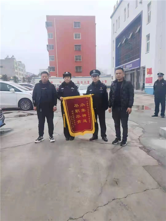 2月25日上午,項(xiàng)城市公安局水寨派出所門(mén)口鑼鼓齊鳴,異常熱鬧,兩名男子手持一面寫(xiě)有“辦案神速、盡職盡責(zé)”字樣的錦旗,送給派出所民警,深表謝意。