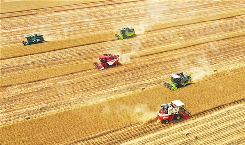 開封市尉氏縣邢莊鄉(xiāng)府李莊村,農(nóng)機服務(wù)隊幫助村民收獲小麥。 李新義攝(中經(jīng)視覺)