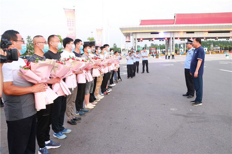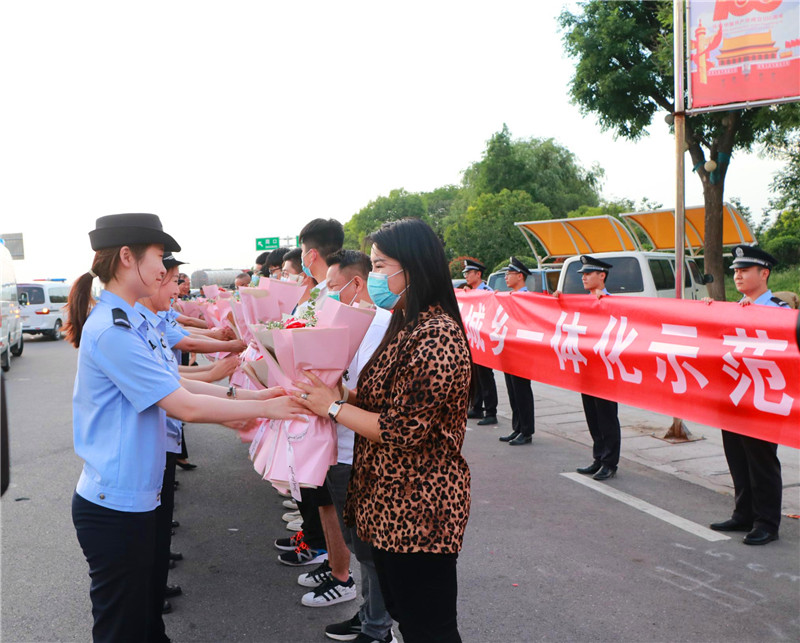當日19時許,示范區(qū)二級調(diào)研員丁有亮,示范區(qū)公安分局黨委書記、局長何學民等同志前往迎接,歡迎勝利歸來的抓捕民警。當抓捕組車輛駛出高速路口時,現(xiàn)場響起熱烈的掌聲。丁有亮、何學民與參戰(zhàn)民警一一親切握手,對凱旋的民警表示歡迎和祝賀,民警代表將象征勝利和榮譽的鮮花獻給抓捕組民警。丁有亮表示向不辱使命、不畏艱險、勇打勝仗的參戰(zhàn)民警表示慰問,并要求他們把握戰(zhàn)機,繼續(xù)擴大戰(zhàn)果,再接再厲,再立新功。何學民指出,示范區(qū)公安分局將乘勢而上、提振士氣,縱深開展“迅雷”行動,出重拳打擊電信詐騙犯罪行為。