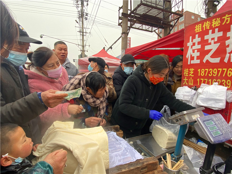 在固墻鎮(zhèn)的集市上,“桂枝熱豆腐”攤位前的顧客絡(luò)繹不絕。“給我來50塊錢的豆腐”“我要20斤,先給我切豆腐吧”“我要30斤,多少錢”……人群將豆腐攤里三層外三層圍了起來,從人群外朝里看看不見豆腐,只看到豆腐攤里冒出來的團團熱氣?!暗攘税雮€小時了,剛才那一盒豆腐沒輪到我就賣完了,這才搶到手。”附近的村民楊大爺拿著剛買的豆腐高興地說。“我從鹿邑來的,姐姐在里面擠著買豆腐,我在這兒等她呢。”9歲的張家瑞說,她每年放寒假都會和家人一起到固墻來探親,過年的時候逛逛集市,順便買些豆腐帶回鹿邑。