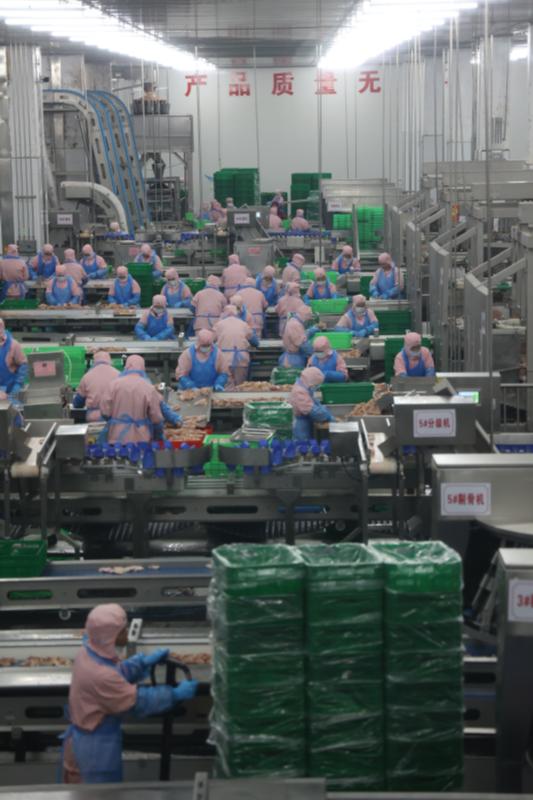 宰殺廠房的燈光比掛雞處的更暗了,除了星星點(diǎn)點(diǎn)的監(jiān)控?zé)艄?,幾乎看不到白羽活雞的運(yùn)動(dòng)軌跡。僅僅一步之遙,進(jìn)入打毛間和掏膛間,白羽雞進(jìn)行退毛,去頭和去爪后,等待清潔預(yù)冷和被精準(zhǔn)分割為雞腿、雞翅、雞胸肉等產(chǎn)品。