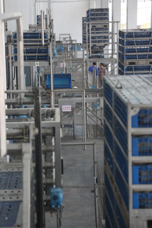 宰雞第一步先消毒,一筐筐自動(dòng)分好的白羽活雞上架后即得到?jīng)_洗,“干干凈凈”地進(jìn)入下一程序——掛雞。步驟與步驟銜接中的自動(dòng)化程度很高,掛雞室光線略暗。“我們采用國(guó)際化標(biāo)準(zhǔn),宰殺環(huán)節(jié)在暗室進(jìn)行?!毕嚓P(guān)人員說(shuō)。
