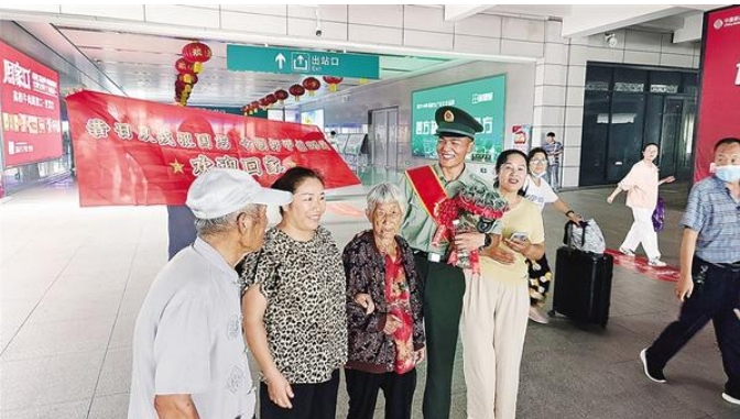 9月4日,在高鐵周口東站出站口,市民們?cè)缭缡睾颍掷瓩M幅,眼里閃著期待的淚光,迎接從部隊(duì)退役的親人。橫幅上的每一個(gè)字,都是家人最深沉的愛(ài)與最由衷的敬佩:“昔日從戎報(bào)國(guó)志,今朝卸甲創(chuàng)輝煌?!?/p>