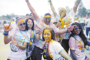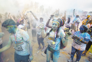 當(dāng)?shù)貢r間6月13日,在美國洛杉磯,約萬名跑步愛好者在洛杉磯道奇球場外參加“彩色跑”活動?!安噬堋笔且豁棅蕵放懿巾椖?,全程為5公里,每公里設(shè)置一個彩色站,當(dāng)參與者跑至彩色站時,由志愿者向參與者拋灑彩色粉末。與傳統(tǒng)跑步競速相比,“彩色跑”活動雖然沒有贏家或獎品,但強(qiáng)調(diào)“參與、娛樂和色彩”的重要性。